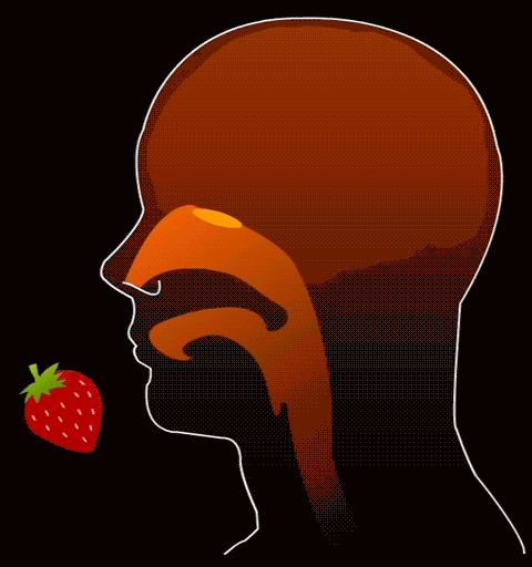 En revanche, les molécules odorantes atteignent plus aisément la muqueuse olfactive lorsque l’on mange ou que l’on boit. Elles remontent vers la muqueuse par le pharynx qui relie l’arrière-bouche au nez : c’est ce que l’on appelle la rétro-olfaction. Arrivées sur cette muqueuse, les molécules volatiles odorantes se posent sur les récepteurs, ce qui provoque l’émission d’influx nerveux. Ceux-ci sont ensuite transmis au cerveau par le nerf olfactif. Extrêmement fragile, la muqueuse olfactive est composée de deux zones de 2 cm2 environ, tapissées de cils microscopiques baignant dans un liquide conducteur qui se renouvelle toutes les deux minutes environ.